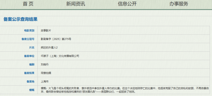 IT之家2月24日消息,国家电影局今日发布关于2025年1月下全国电影剧本(梗概)备案、立项公示的通知,其中出现了《疯狂的外星人2》的身影,编剧为刘晓丹(《疯狂的外星人》《二手杰作》《红毯先生》),备案单位为坏猴子(上海)文化传播有限公司。